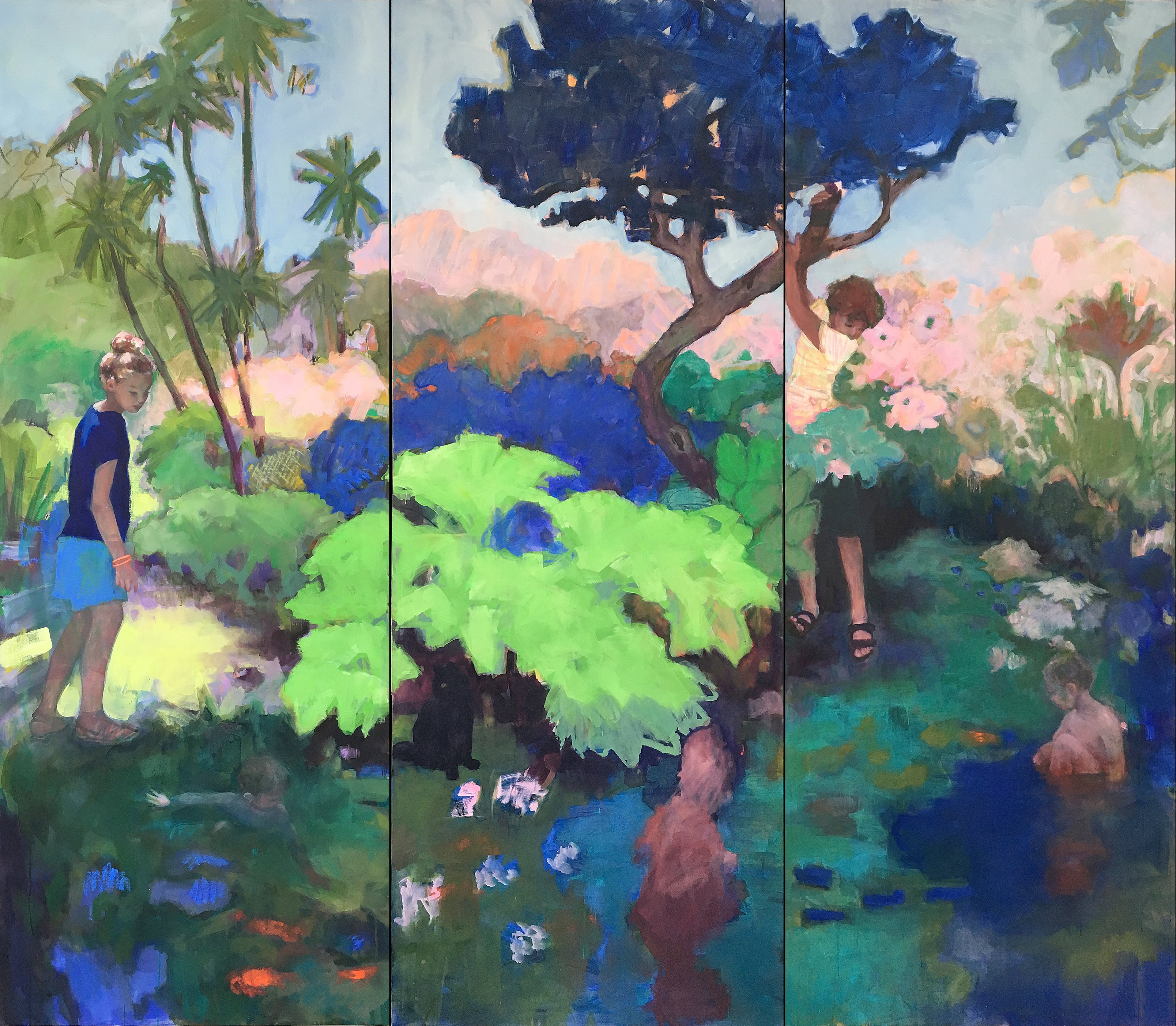 constituent les différents enjeux de son travail pictural. « Je préfère la lumière tombante, entre chien et loup. » Ce moment hors du temps, moment limite, entre la fin du jour et le début de la nuit. Armée de son téléphone, elle photographie le paysage plongé dans un état flottant où les définitions s’évaporent. Des dizaines et des dizaines d’images sont prises d’une manière spontanée, mouvante, pour ne jamais fixer cet espace instable et fragile. La méthode, volontairement sauvage et incontrôlée, engendre l’erreur, l’accident, le flou et l’insaisissable. Des failles que Sandrine Rondard fouille dans la matière, le dialogue des couleurs et les trouées lumineuses. Du rose, du gris, du vert. Avec un sourire malicieux, l’artiste dit concevoir ses images « à la manière d’un chef opérateur ». Elle met en place un décor, pose un cadre, dirige ses acteurs, choisit une lumière, crée une ambiance, met en mouvement une scène. Le cinéma et l’histoire de la peinture sont les moteurs de son imaginaire. De Francis Bacon à Michelangelo Antonioni, en passant par Chardin, Ozu, Doig, Turner ou encore Lynch, tout est prétexte au travail des mouvements de l’image. Lorsque le décor est saisi, l’artiste fait intervenir des figurants, de jeunes personnages, le plus souvent des enfants. Ces derniers, du fait de leurs gestes impulsifs et spontanés, injectent davantage de mouvement, de liberté. Les photographies sont ensuite transposées à l’huile sur la toile. Les images sont travaillées plan par plan. L’artiste crée ainsi des espaces où peuvent se dissimuler l’étrange, le mystère et tout ce qui se cache dans la matière de la peinture. Entre chien et loup. Cet instant, entre deux temporalités, deux atmosphères, deux mondes, est peuplé de paradoxes qu’elle explore sans relâche. Un mystère plane. Les figures juvéniles ne sont pas identifiables, trop éloignées, de dos, plongées dans l’obscurité, masquées, agitées. Il nous est impossible de nous projeter dans un visage, les regards se dérobent.