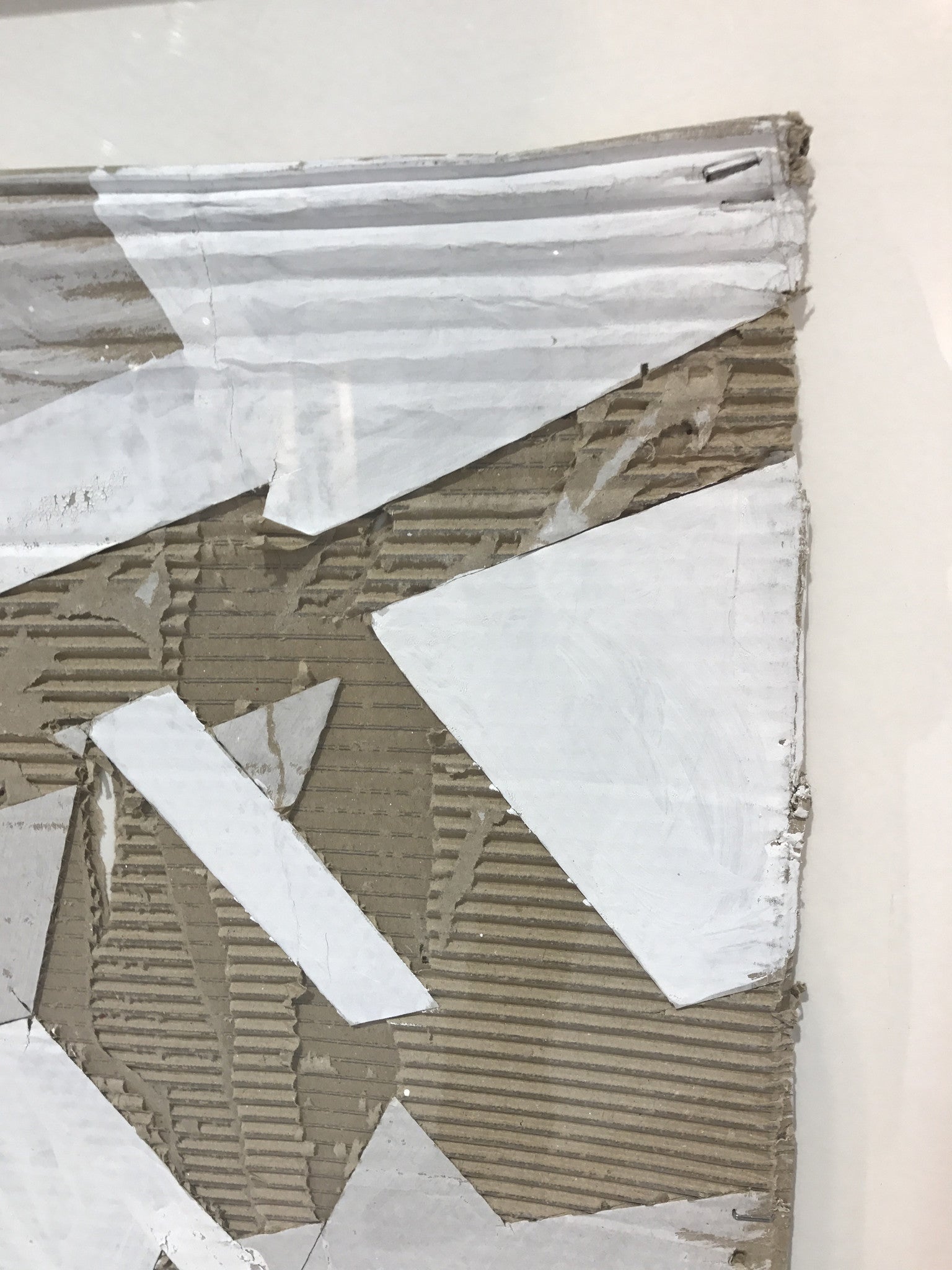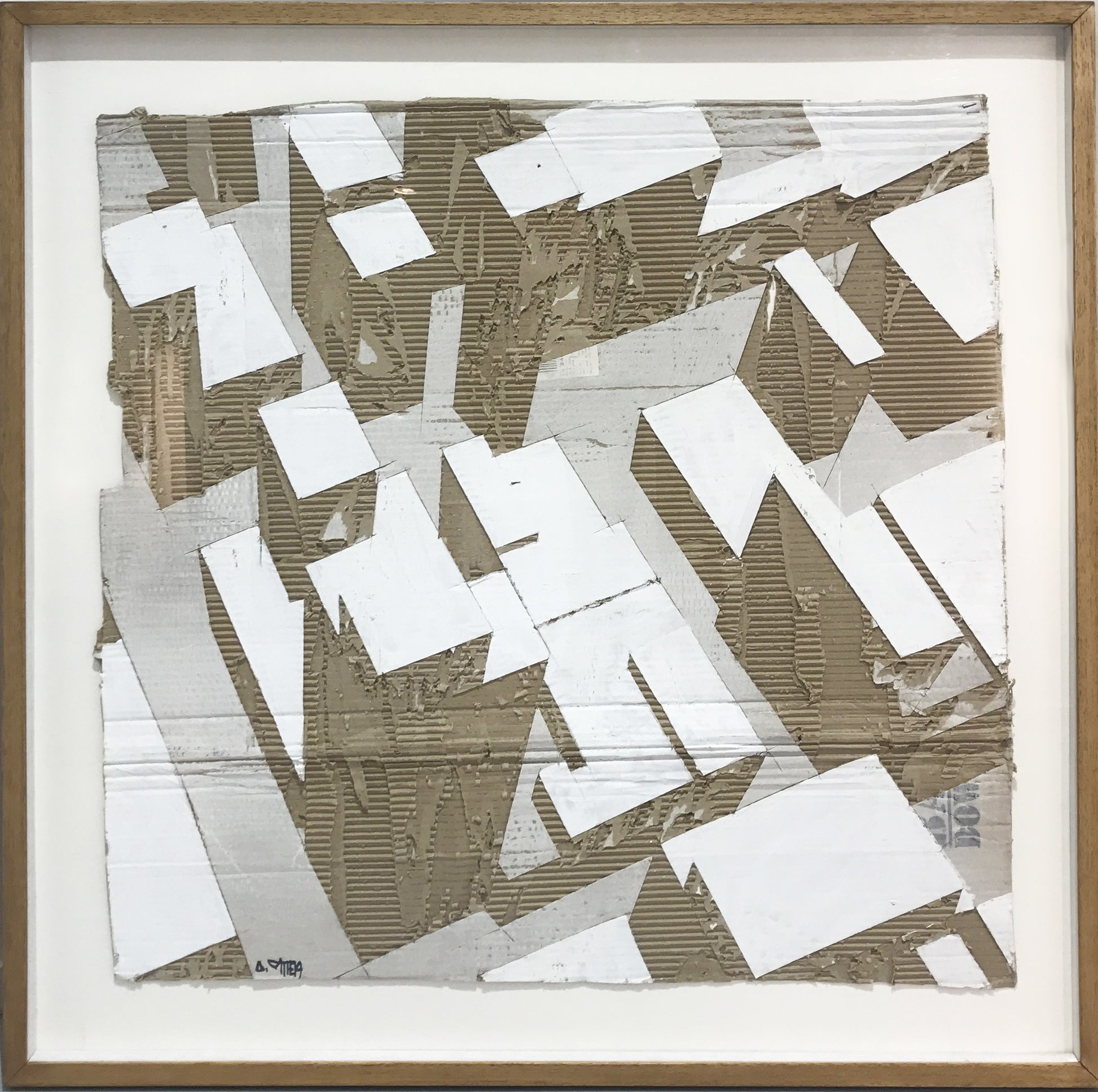 Playing on the roughness and the life behind the cardboard, he applies black streaks of paint in dappled areas, vertically or horizontally; he then rips, cuts and tears off layers, until the corrugated texture hidden within appears. There is not the single collage in this technique: the volume comes in negative, inside cardboard.