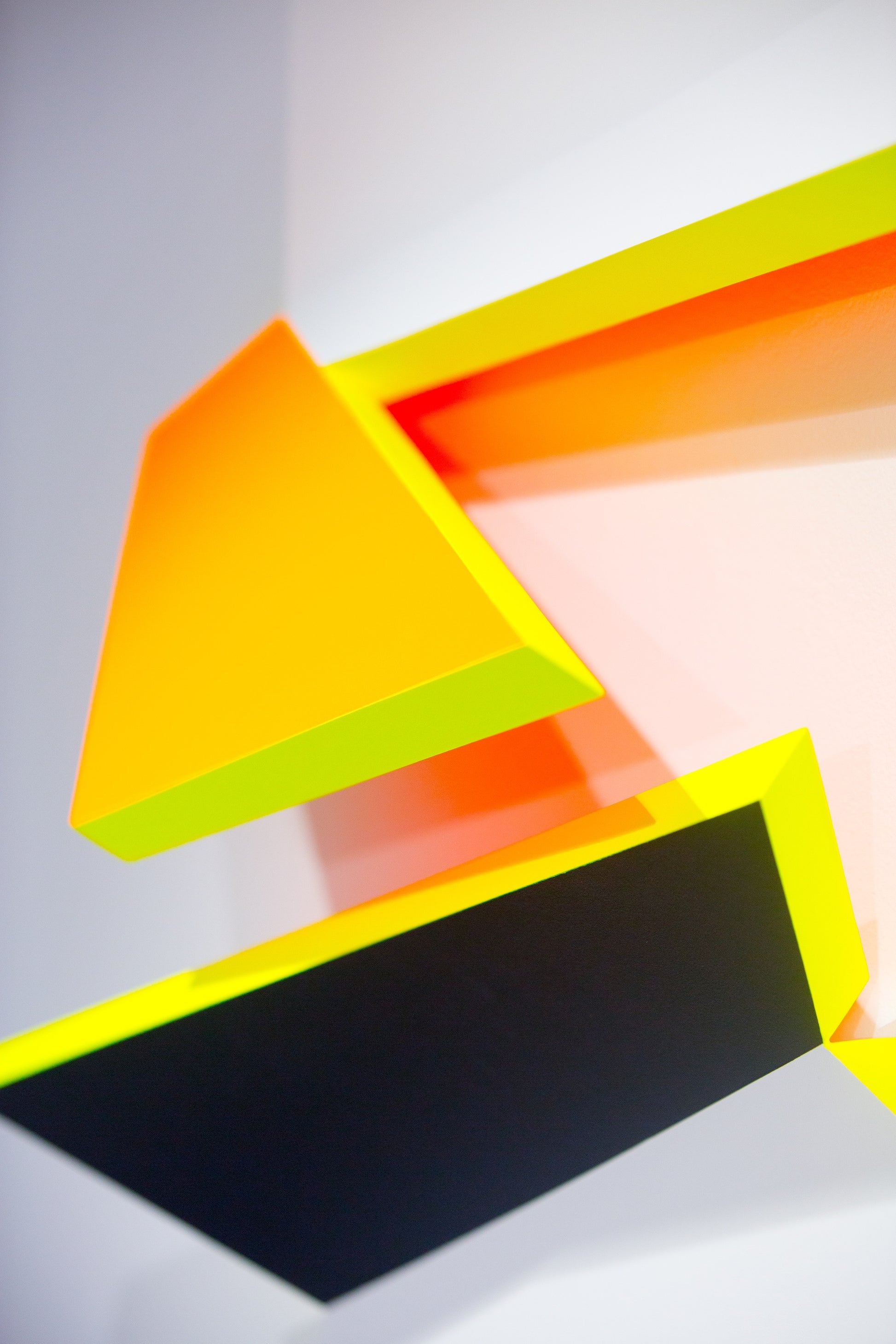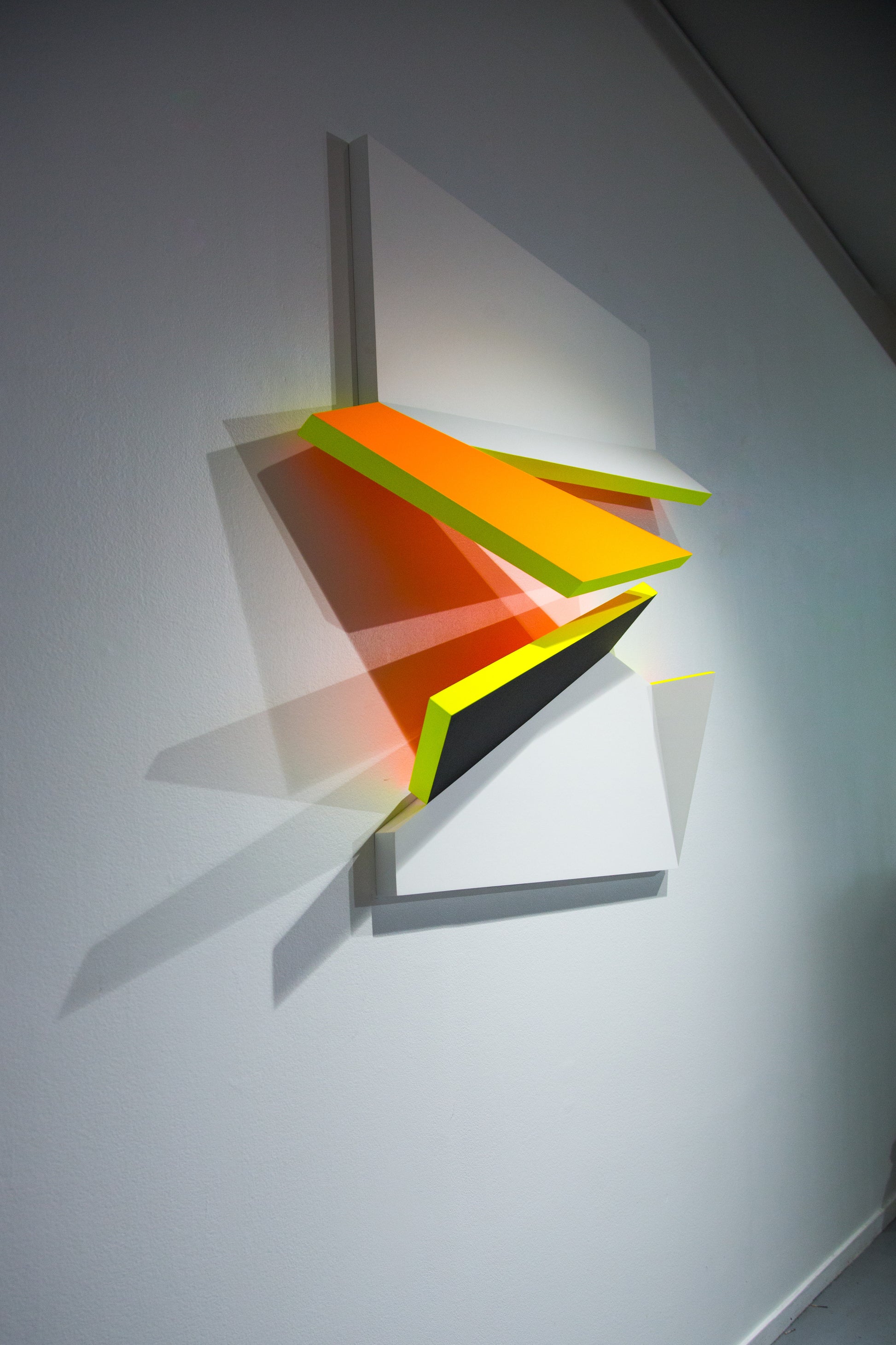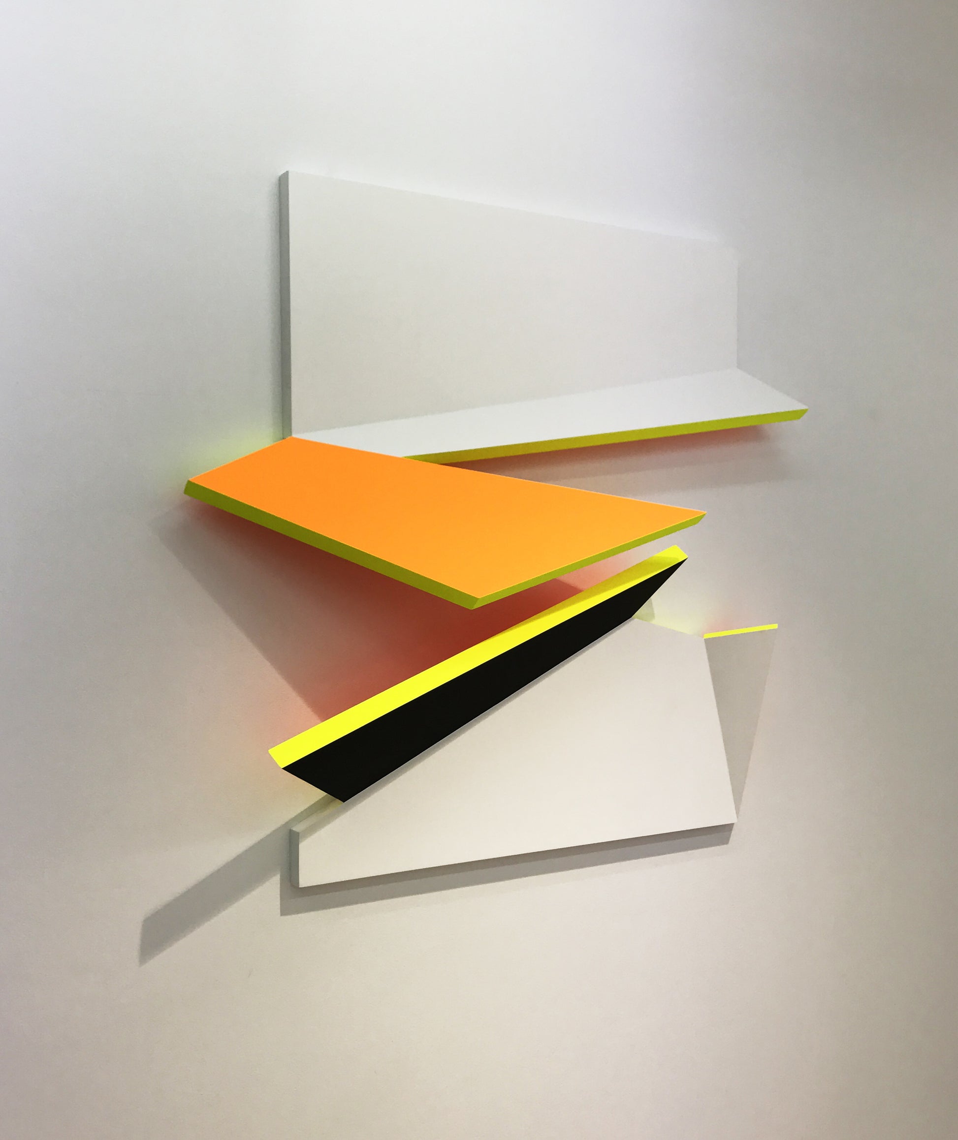 Pour la série Hors Cadre - en plusieurs chapitres, entamée en 2015, Evrard & Koch propose une oeuvre inclassable, qui tient aussi bien de l’architecture que de la peinture ou de la sculpture. La surface blanche se fracture, laissant apparaitre dans ses tranches des pigments puissants qui se réfractent sur le mur ou sur les miroirs intégrés; une oeuvre multiple qui se redessine selon l’angle d’approche. Toujours minimaliste de face, le blanc, le noir ou le miroir rythment la surface à mesure que l’on se déplace, tandis que la couleur palpite secrètement en son intimité et se répand au dehors. C’est la revanche du hors champ, de l’envers sur l’endroit, du latéral sur le facial. Une oeuvre vibrante et juste.