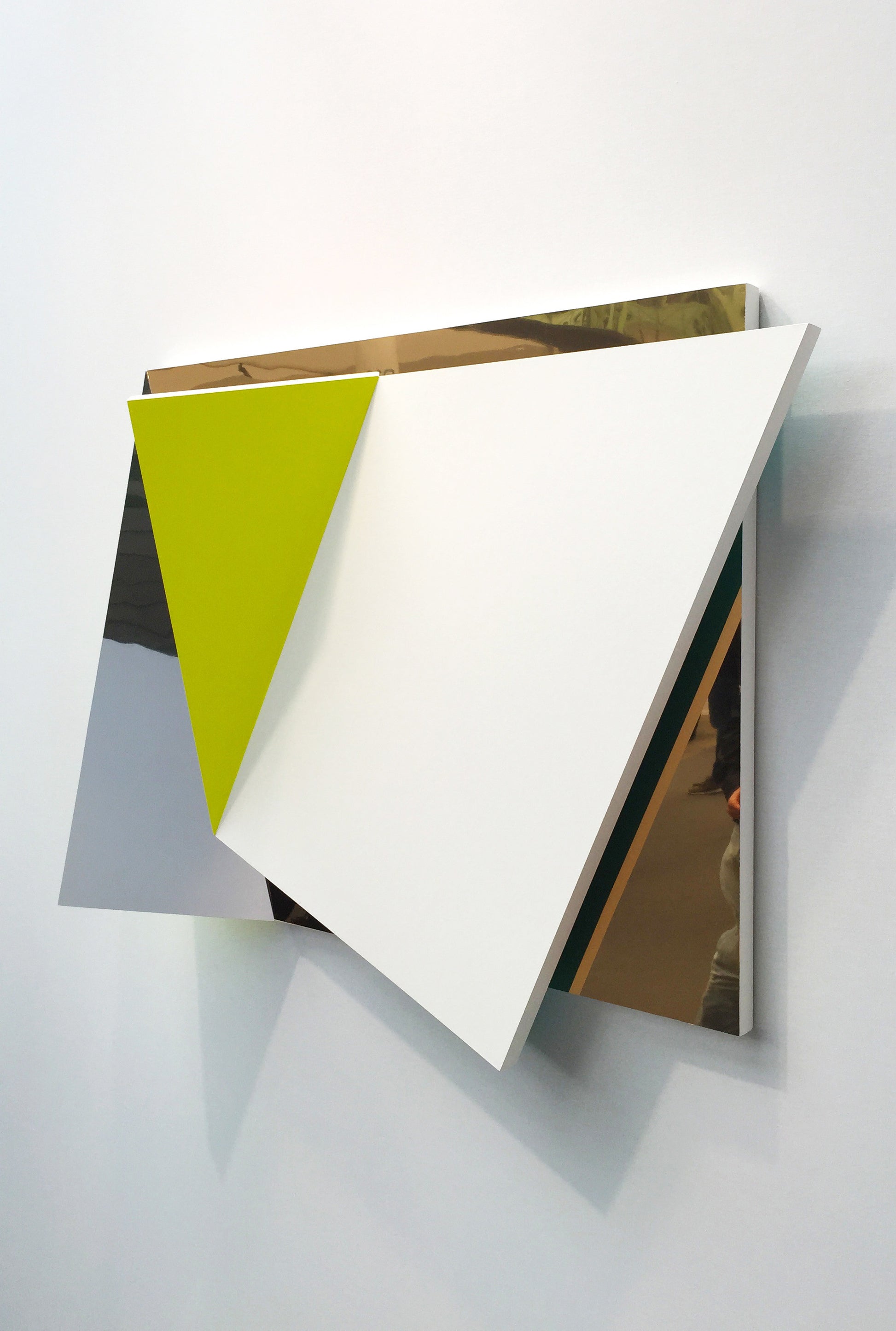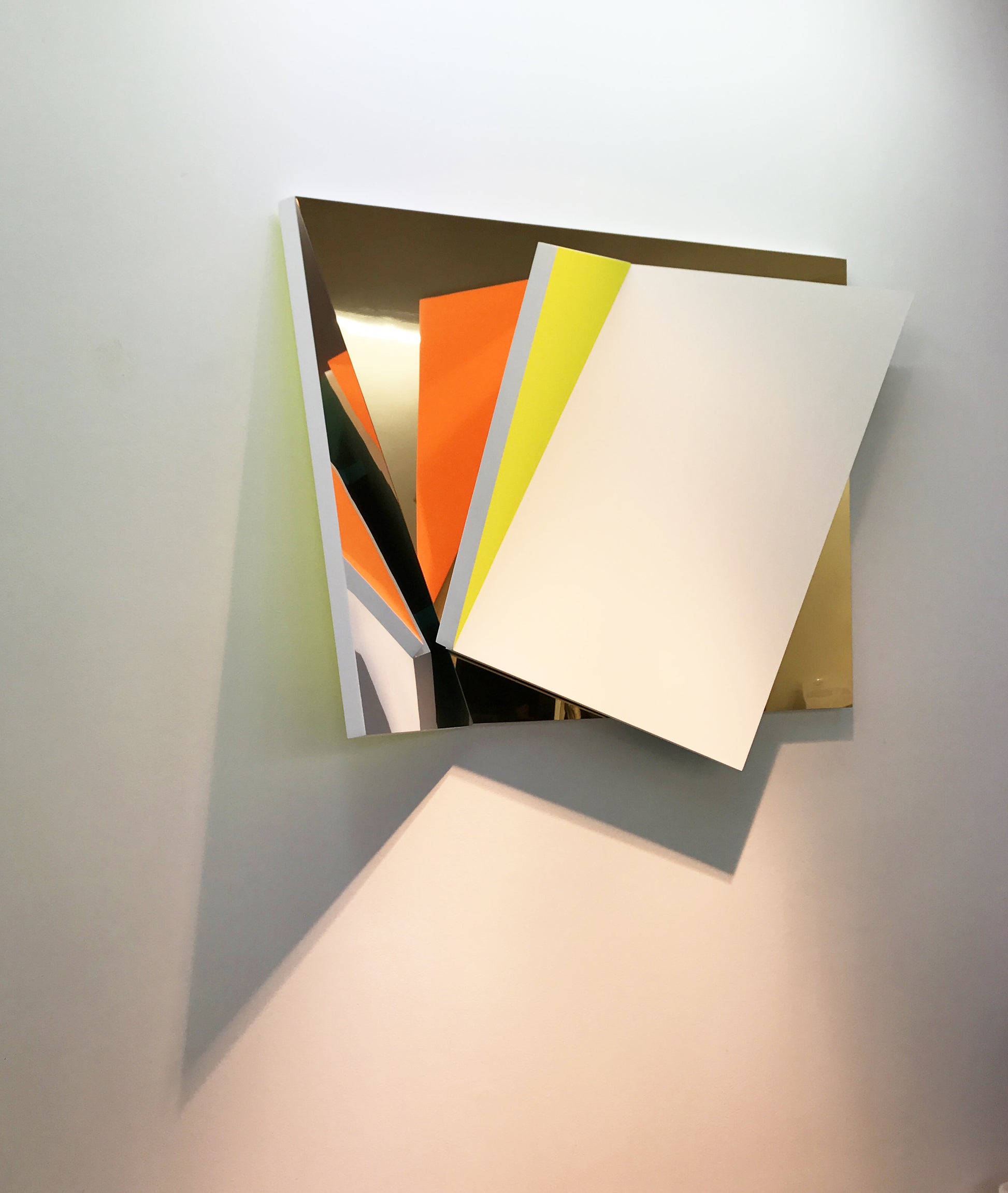 Pour la série Hors Cadre - en plusieurs chapitres, entamée en 2015, Evrard & Koch propose une oeuvre inclassable, qui tient aussi bien de l’architecture que de la peinture ou de la sculpture. La surface blanche se fracture, laissant apparaitre dans ses tranches des pigments puissants qui se réfractent sur le mur ou sur les miroirs intégrés; une oeuvre multiple qui se redessine selon l’angle d’approche. Toujours minimaliste de face, le blanc, le noir ou le miroir rythment la surface à mesure que l’on se déplace, tandis que la couleur palpite secrètement en son intimité et se répand au dehors. C’est la revanche du hors champ, de l’envers sur l’endroit, du latéral sur le facial. Une oeuvre vibrante et juste.