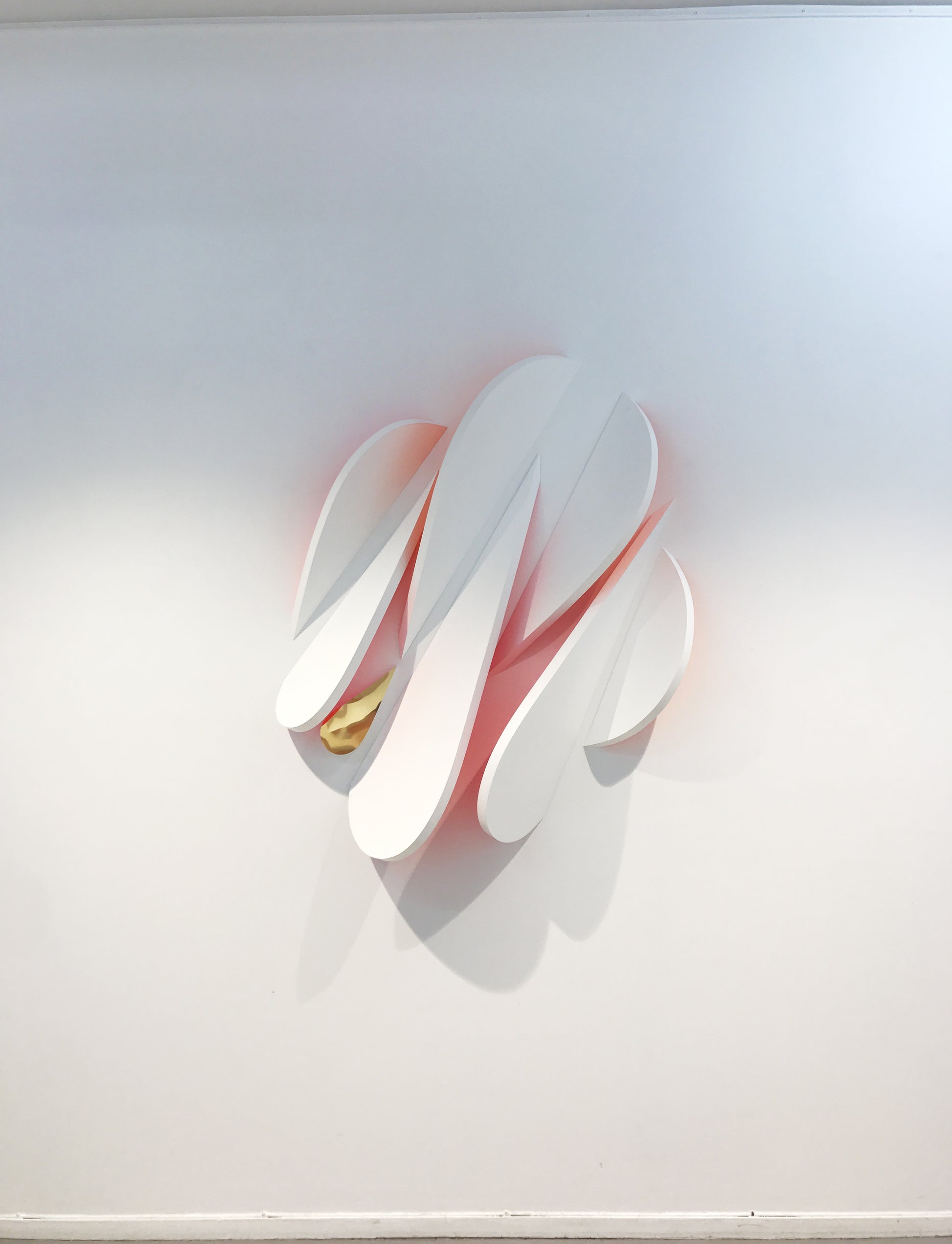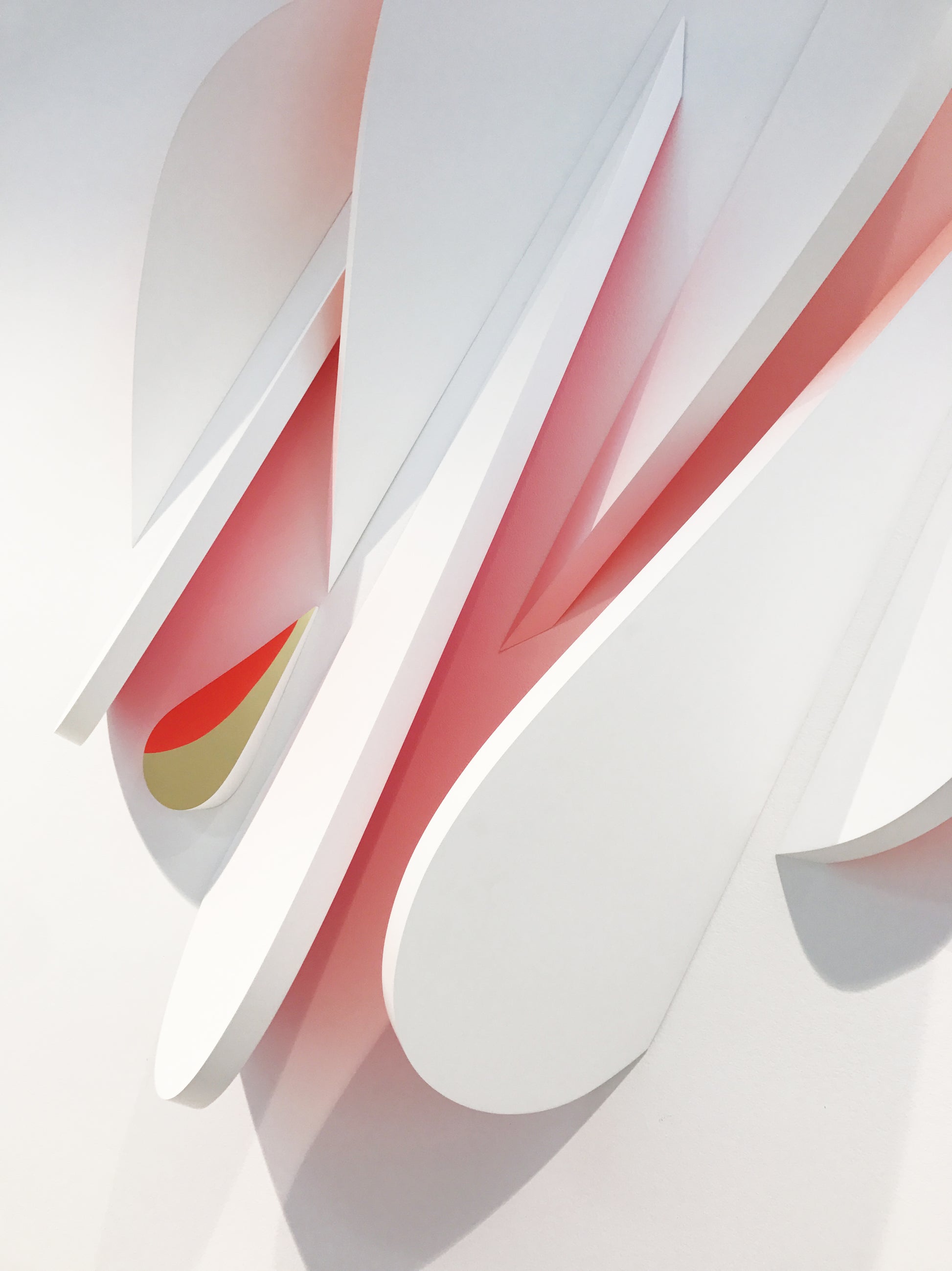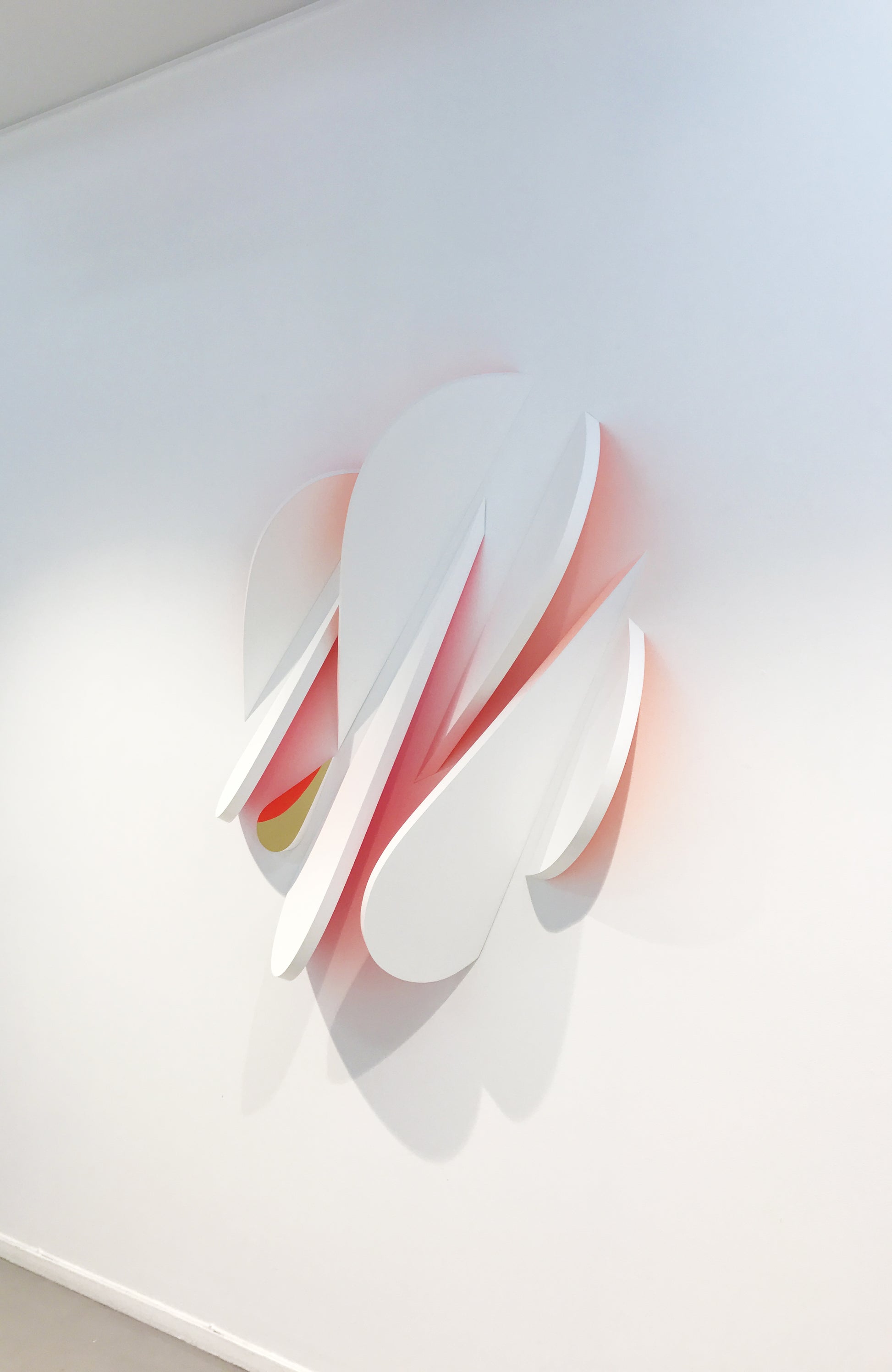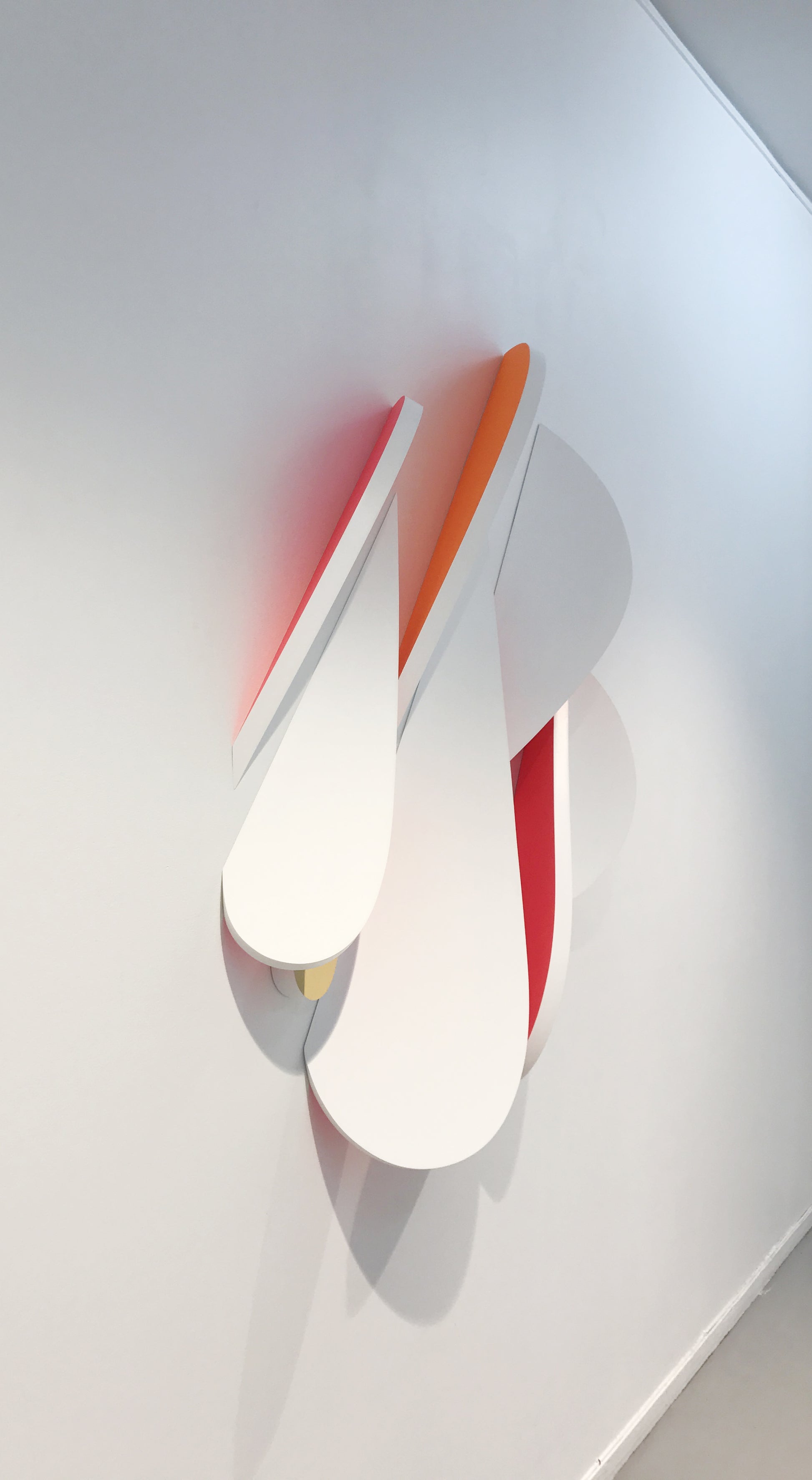 Pour la série Hors Cadre - en plusieurs chapitres, entamée en 2015, Evrard & Koch propose une oeuvre inclassable, qui tient aussi bien de l’architecture que de la peinture ou de la sculpture. La surface blanche se fracture, laissant apparaitre dans ses tranches des pigments puissants qui se réfractent sur le mur ou sur les miroirs intégrés; une oeuvre multiple qui se redessine selon l’angle d’approche. Toujours minimaliste de face, le blanc, le noir ou le miroir rythment la surface à mesure que l’on se déplace, tandis que la couleur palpite secrètement en son intimité et se répand au dehors. C’est la revanche du hors champ, de l’envers sur l’endroit, du latéral sur le facial. Une oeuvre vibrante et juste.