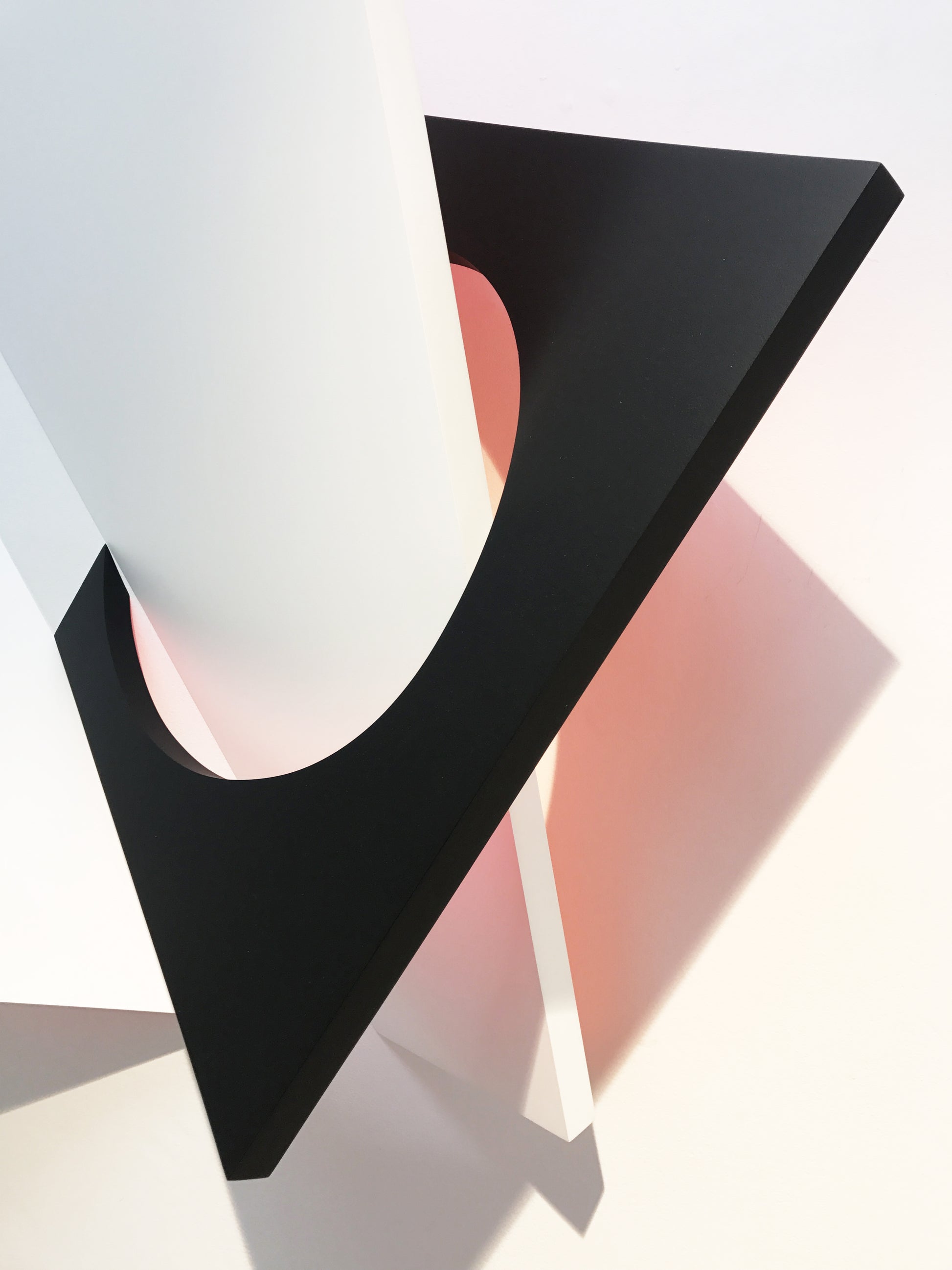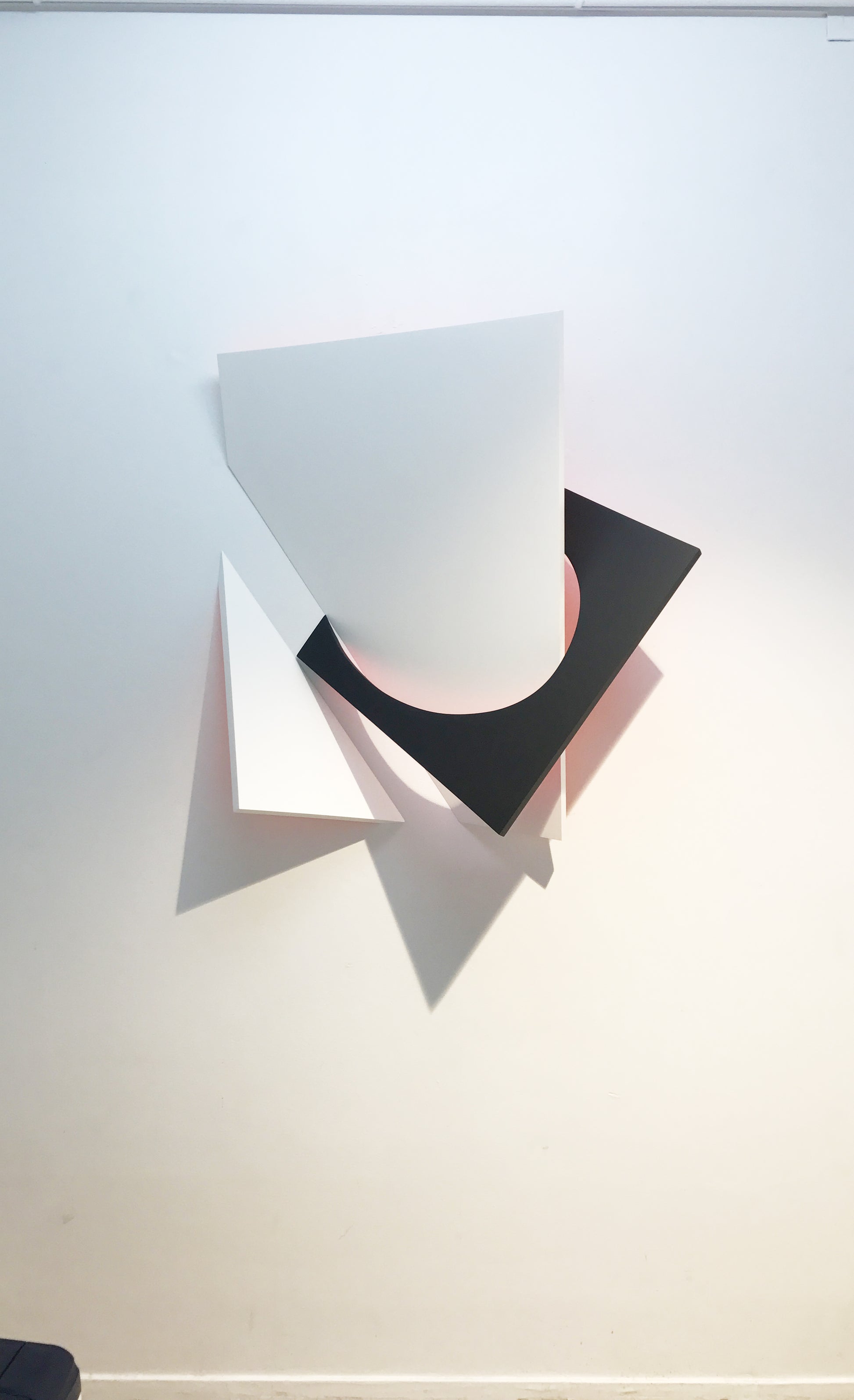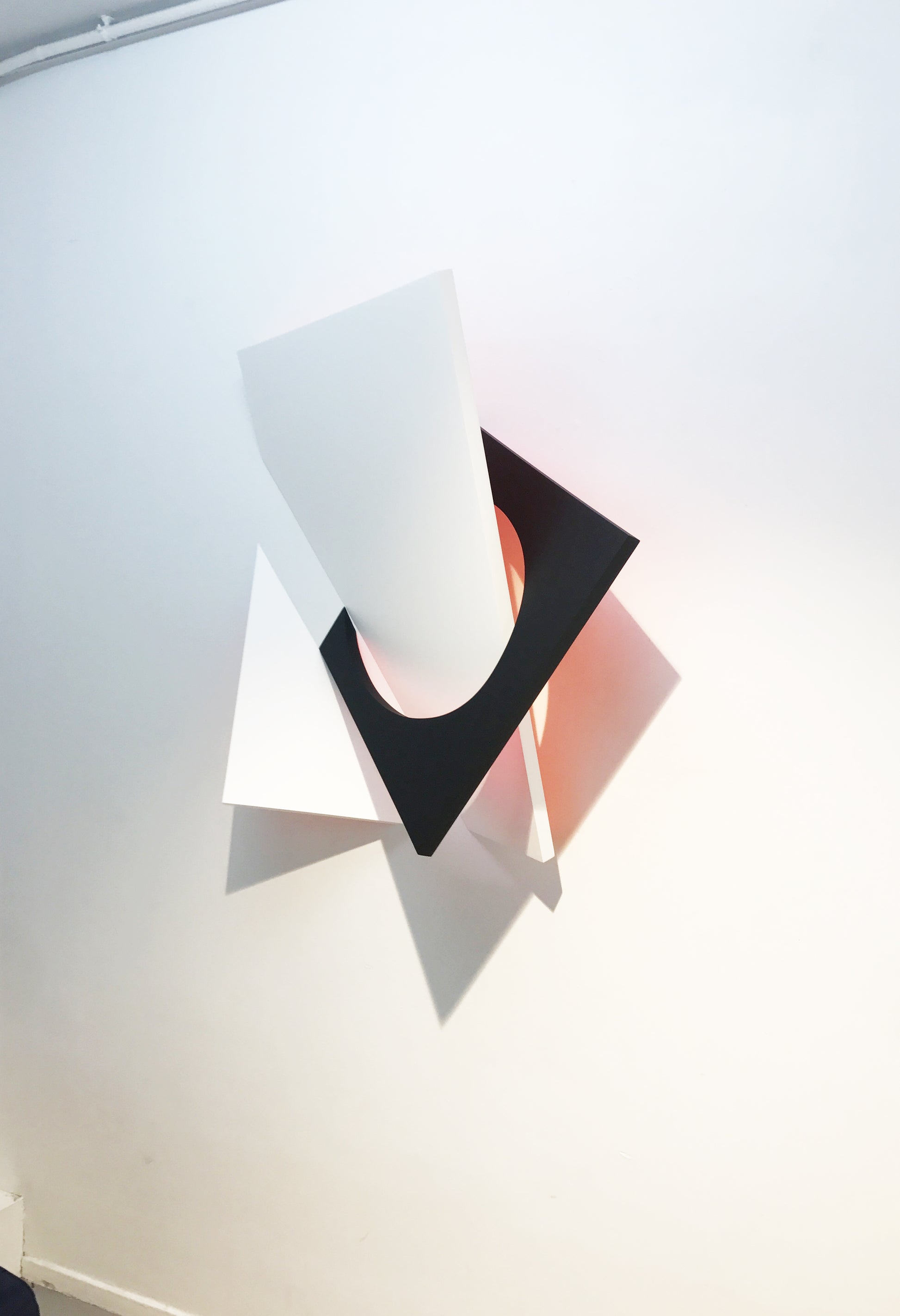 For Frame/Out series, started in 2015, Evrard & Koch duet reveal in an unclassifiable work, that combines architecture, painting and sculpture. The white surface is broken up, revealing in its spine powerful pigments that refract on the wall or on the integrated mirrors, thus creating a multiface artwork that changes depending on the angle of view. Always minimalist with a front view, white or black pigments and mirror give rhythm to the surface as we move around, while colors secretly palpitates in the heart of the artwork and spread outside. It is the revenge of the out-of-scope, of the back versus the front, of the side versus the face. A vibrant and unique work.