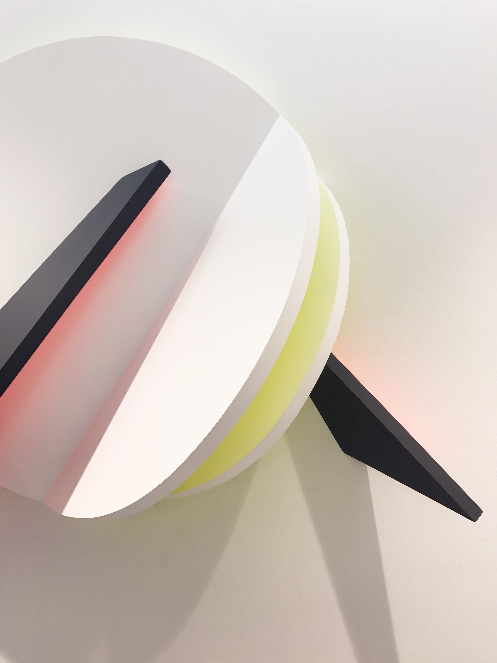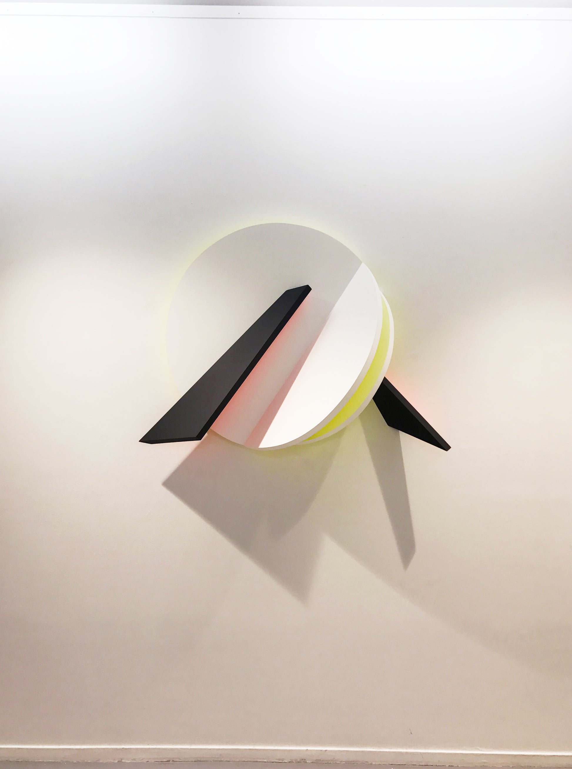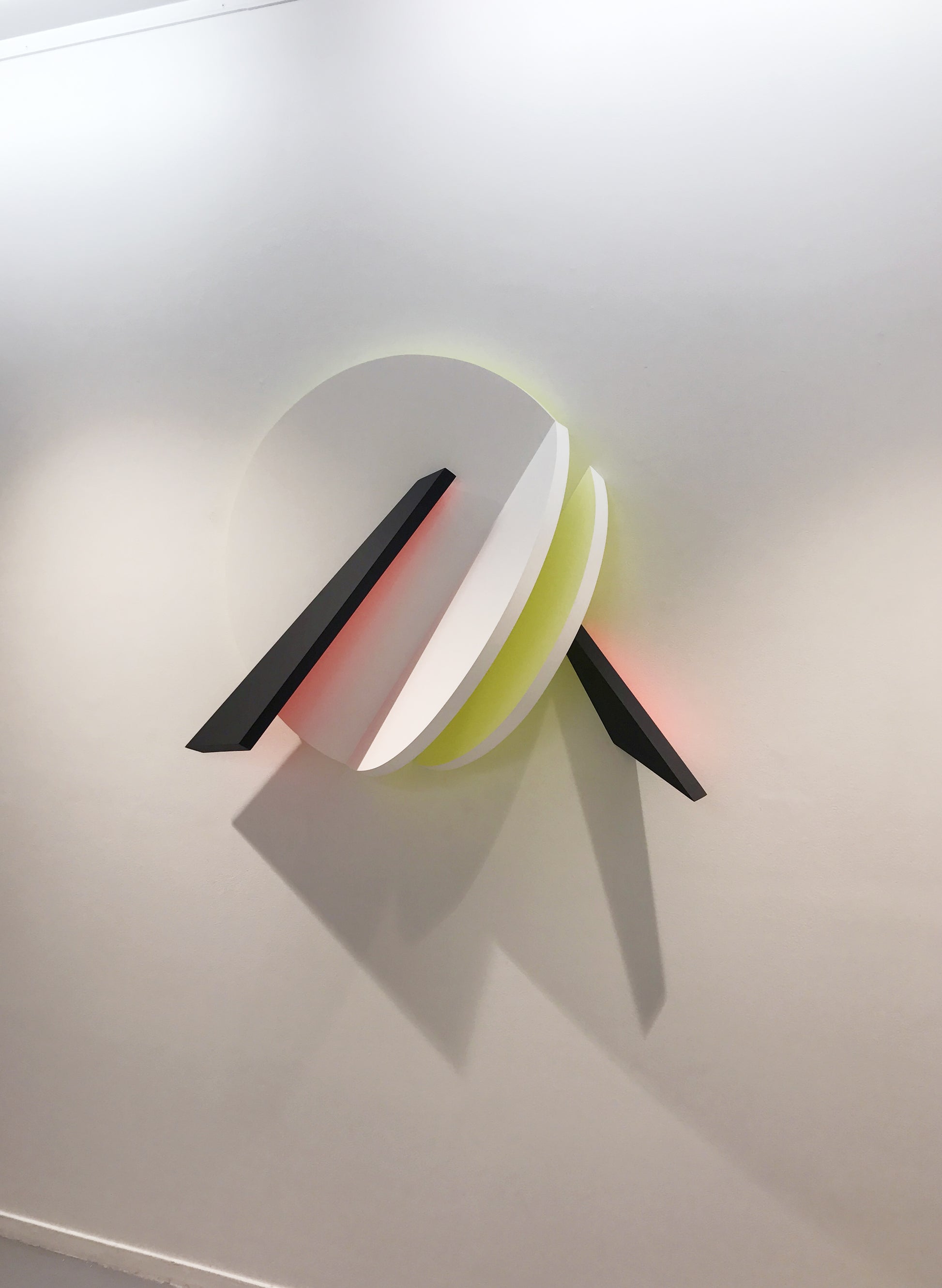 Pour la série Hors Cadre - en plusieurs chapitres, entamée en 2015, Evrard & Koch propose une oeuvre inclassable, qui tient aussi bien de l’architecture que de la peinture ou de la sculpture. La surface blanche se fracture, laissant apparaitre dans ses tranches des pigments puissants qui se réfractent sur le mur ou sur les miroirs intégrés; une oeuvre multiple qui se redessine selon l’angle d’approche. Toujours minimaliste de face, le blanc, le noir ou le miroir rythment la surface à mesure que l’on se déplace, tandis que la couleur palpite secrètement en son intimité et se répand au dehors. C’est la revanche du hors champ, de l’envers sur l’endroit, du latéral sur le facial. Une oeuvre vibrante et juste.