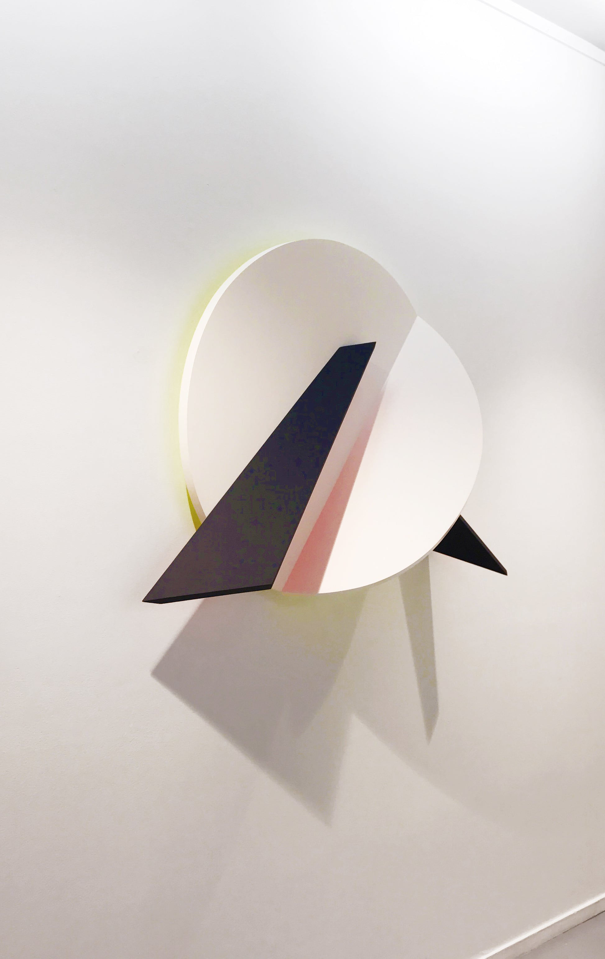 For Frame/Out series, started in 2015, Evrard & Koch duet reveal in an unclassifiable work, that combines architecture, painting and sculpture. The white surface is broken up, revealing in its spine powerful pigments that refract on the wall or on the integrated mirrors, thus creating a multiface artwork that changes depending on the angle of view. Always minimalist with a front view, white or black pigments and mirror give rhythm to the surface as we move around, while colors secretly palpitates in the heart of the artwork and spread outside. It is the revenge of the out-of-scope, of the back versus the front, of the side versus the face. A vibrant and unique work.